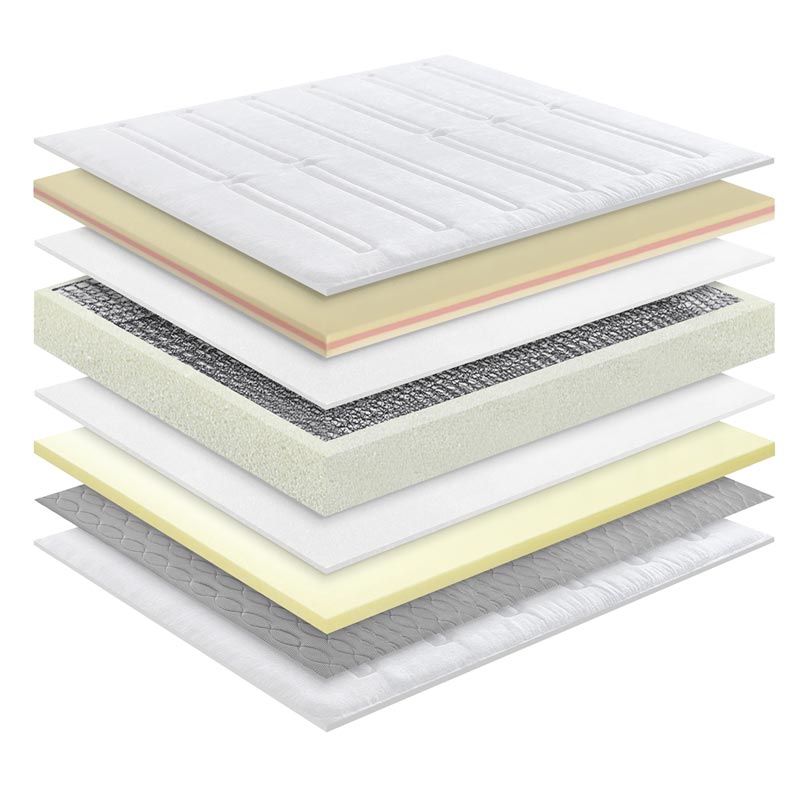 Горниот комфорен слој користи мемориска пена со висока отпорност која реагира на телесната температура и тежината.